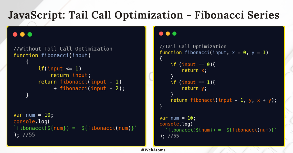 Let's learn how to write a Fibonacci Sequence example in JavaScript with and without the tail call optimization.